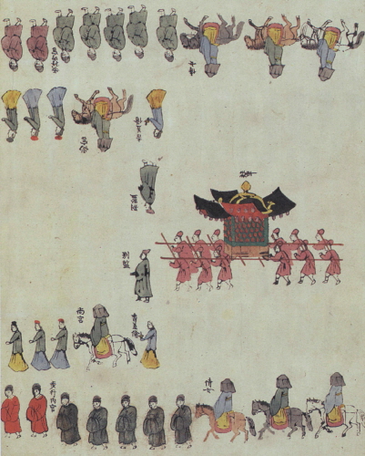 육례 절차는 납채(納采), 납징(納徵), 고기(告期), 책비(冊妃), 친영(親迎), 동뢰연(同牢宴)의 순서로 진행된다.153) 육례 절차를 따르는 국가 최고의 경사