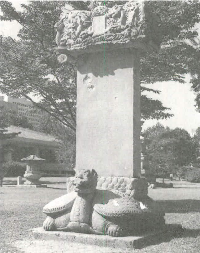 이 비갈을 살펴보면 용두화된 귀두를 오른쪽으로 돌리고 있는 것이 특이하다. 물고기의 지느러미 같은 넓은 날개를 귀두 좌·우에 장식하고 있으며 귀갑 중앙에는 앙련과 복련으로 이루어진 높직한 비좌가 있어 비신을 받고 있다. 비신의 앞면 주연에는 당초문대를 조각하고 그 안에 비문을 각자하였으며 양쪽 측면에는 보상화문을 조각하였다. 이수는 운룡문이 조각되어 있 는 바 사적비로서는 대표적인 수작이라고 하겠다.
