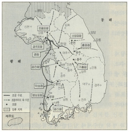 조세는 모두 현물로 납부되었는데, 평안도와 함경도는 국경에 가깝고, 특히 평안도는 사신의 내왕이 잦은 곳이라 하여, 이 지역에서 받은 조세는 현지에서 군사비와 사신 접대비로 쓰도록 하였다. 수납한 조세는 강가나 바닷가의 조창에 모아 두었다가 전라도, 충청도, 황해도는 바닷길로, 강원도는 한강, 경상도는 낙동강과 남한강을 통해 한양의 용산과 서강에 있는 경창으로 운송하였다.