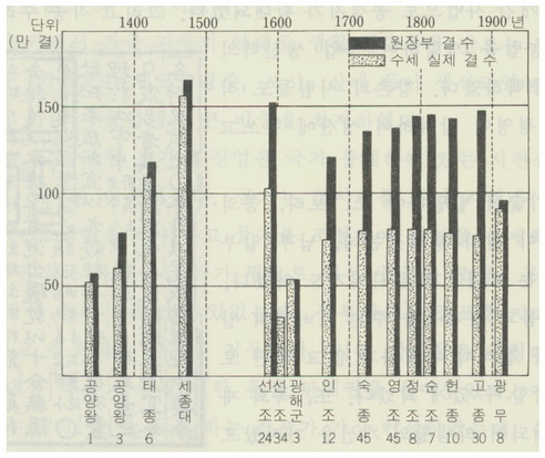 국가 재정을 위한 조세 제도는 전통적으로 조, 용, 조를 기초로 하고 있었다. 즉, 토지에 부과되는 전세, 가호마다 부과되는 공납, 그리고 호적에 등재된 정남에게 부과되는 역 등이 국가 재정의 기초였다.