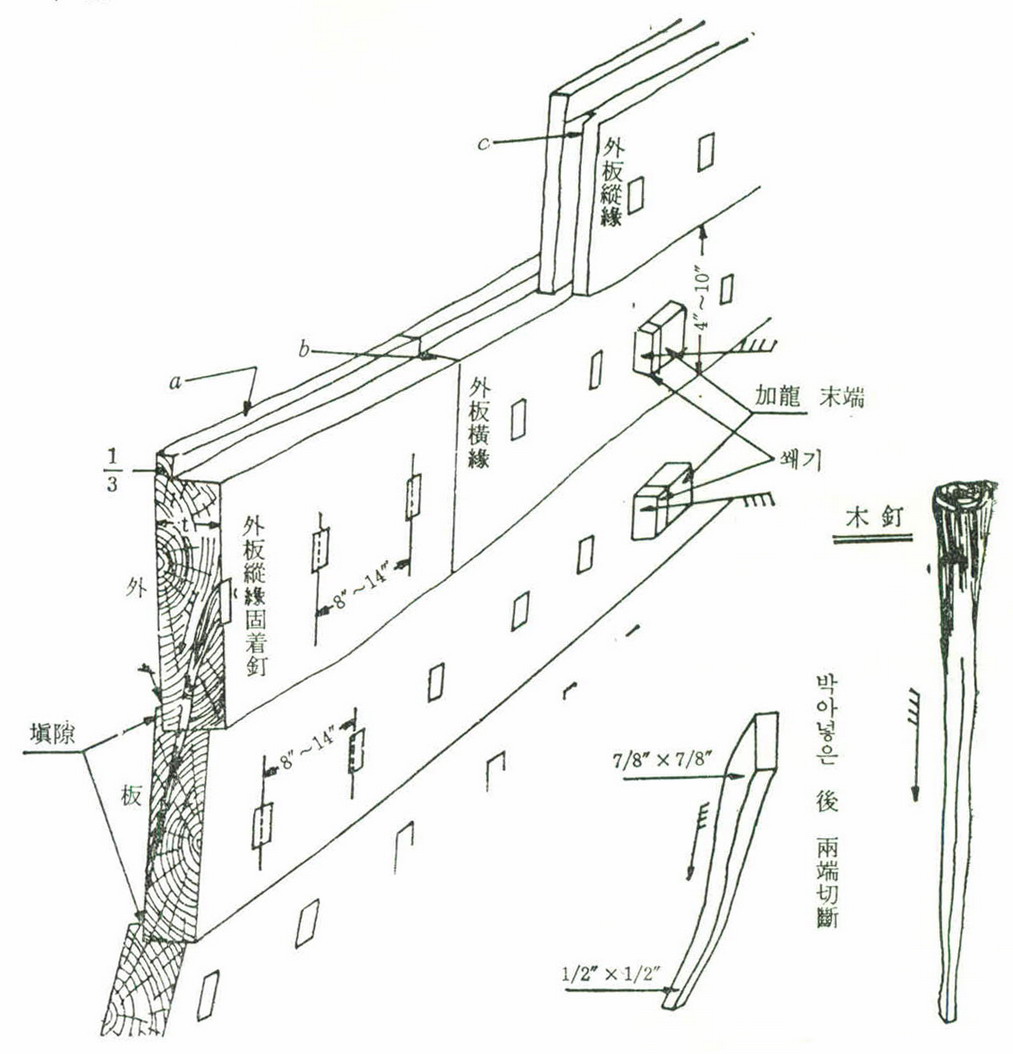 한선 외판의 모양과 고착방법은<그림 3>과<그림 4>에 잘 나타나 있다.<그림 3>에서 보면, 저판에 이어 不者里가 고착되고, 그 위로 외판재를 이어올려 동두틈에 이르러 그친다. 현대선박에서라면 부자리는 龍骨 바로 옆에 붙어있는 龍骨翼板(garboard strake), 동두틈은 갑판에 붙어있는 舷側厚板(sheer strake)에 해당하는 최하와 최상층의 외판재이다.
