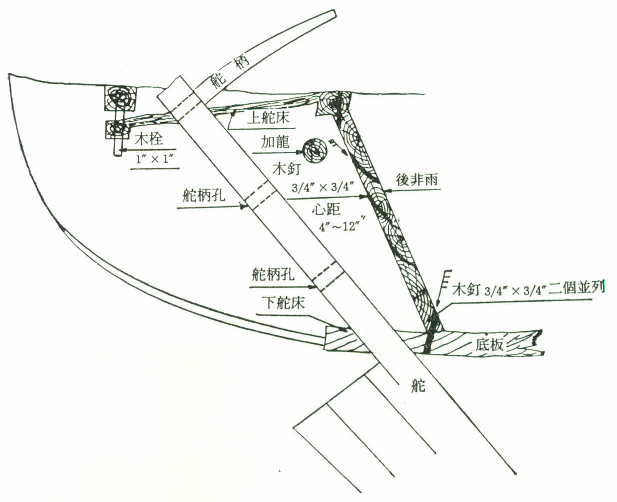 <그림 7>은 근래의 한선에서 흔히 보는 선미부분의 구조이다. 船尾材는 가로로 넓은 평면을 이루고, 밑은 저판에, 그리고 좌우양현은 선미 후방으로 뻗어나온 외판에 고정되어 있다.