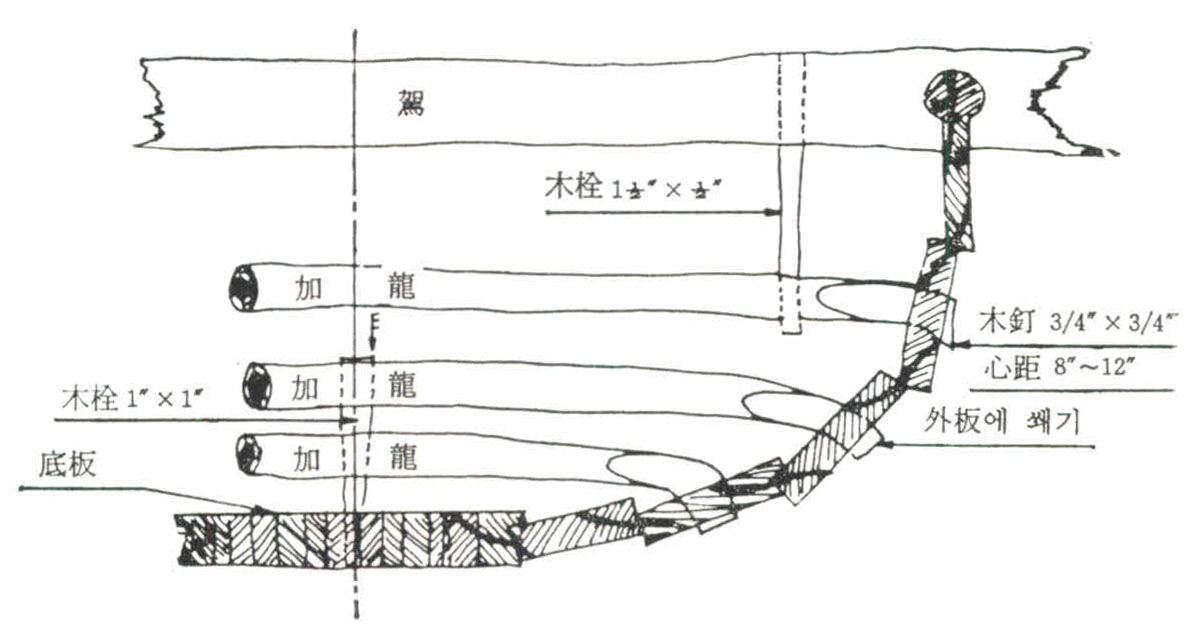 저판·외판·선수재·선미재 등을 서로 고착하여 배의 껍질인 船殼이 만들어지고 나면 거기에 필요한 만큼 駕木과 加龍木이 설치되어야 한다.