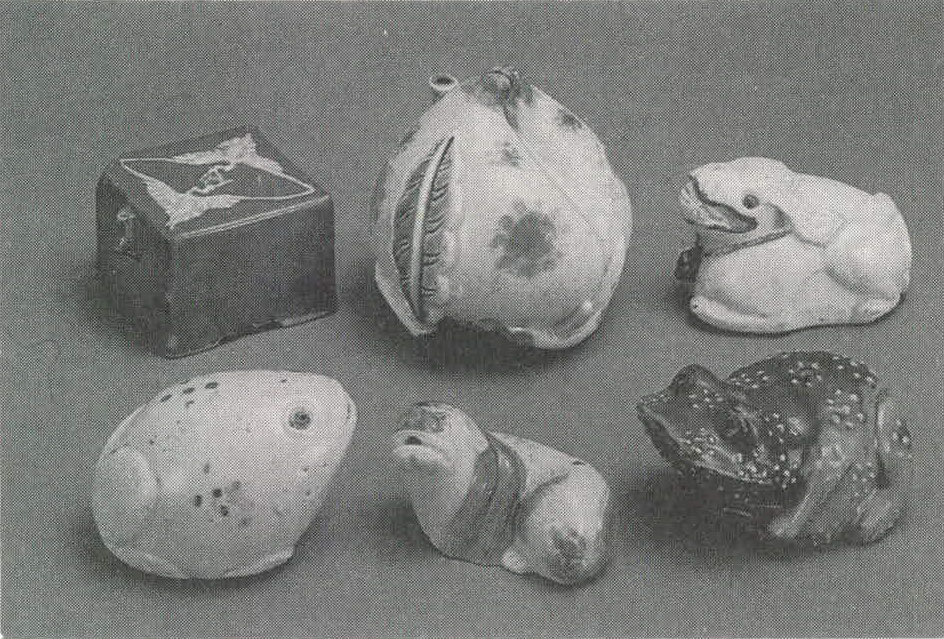 器形에 있어서는 수많은 상형의 연적이 제작되고 있었다. 개구리·두꺼비·해태·토끼·잉어·복숭아·금강산·무릎·사각·팔각·두부·또아리 등의 다양하고 아름다운 형태가 만들어졌다(<사진 4>). 筆筒에 있어서는 십자형·連環形·格字·파초·포도·연화·운룡 등의 문양과 투각기법의 필통이 제작되었다. 그리고 祭器접시의 방형·원형의 크고 작은 모습과 盒·벼루·필가·筆洗·墨壺·화장합·油甁·접시·花形盞·酒杯·단지·술병·주전자·촛대 등의 생활용기가 다양한 형태로 제작·사용된 백자의 전성기였다.735)尹龍二,<朝鮮 19世紀 分院白瓷의 特色>(≪廣州分院里窯産 靑畵白瓷≫-梨花女大博物館 特別展圖錄 22-, 1994).
